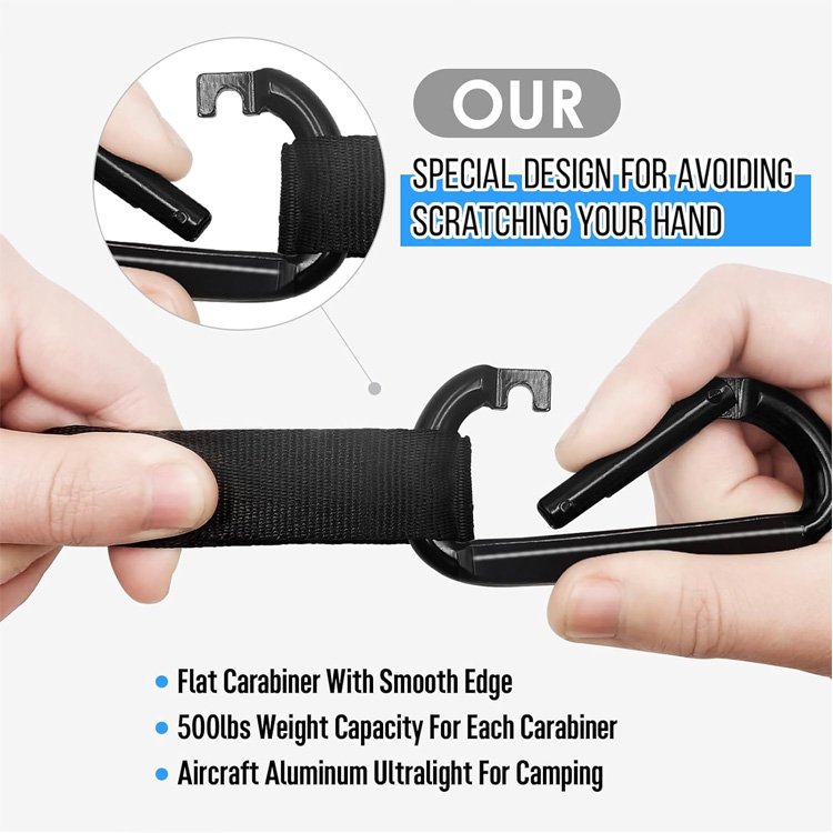 15+ लुप पोइन्टहरू र सैन्य-ग्रेड एल्युमिनियम क्याराबिनरहरू सहित दुई 10-फिट समायोज्य रूख पट्टिहरू समावेश गर्दछ, रूखहरूमा 12 देखि 25 फिट टाढाको छाललाई हानि नगरी सुरक्षित स्थापना सक्षम पार्दै।