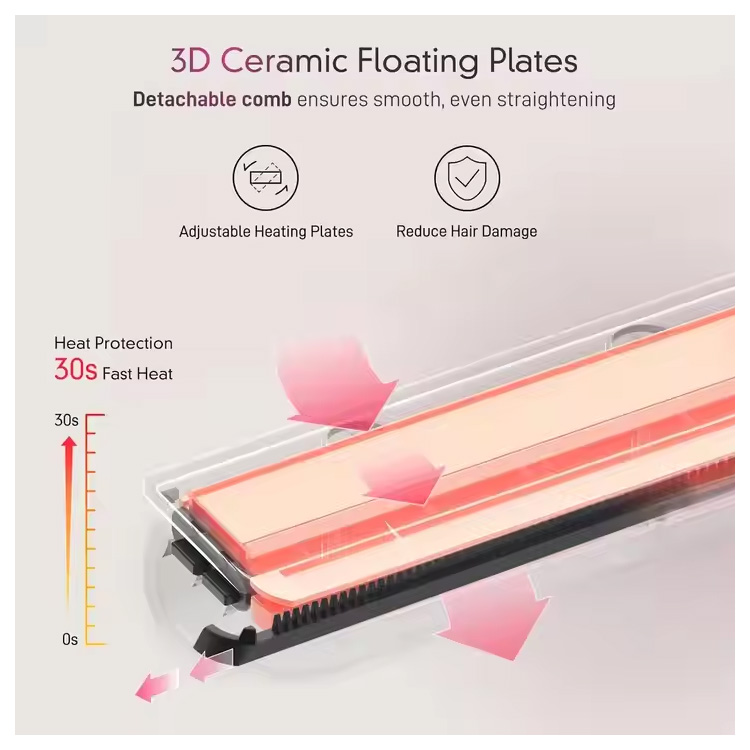 यो स्ट्रेटनरले कपालको शाफ्टमा बिस्तारै प्रवेश गर्न इन्फ्रारेड ताप प्रयोग गर्दछ, कपाललाई भित्रबाट तताउँछ। यसले नमीमा ताल्चा लगाउँदा सतहमा हुने क्षतिलाई कम गर्छ, जसले गर्दा सुधारिएको बल र लोचको साथमा चिल्लो, चम्किलो कपाल हुन्छ।