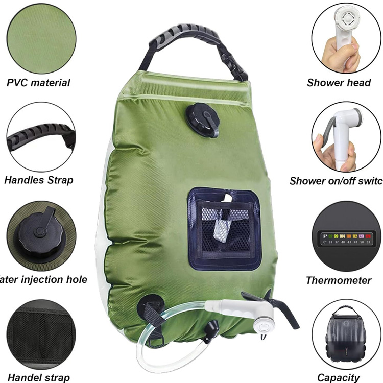 यसको फराकिलो 20-लिटर भोल्युमको साथ, यो नुहाउने झोलाले 2-3 व्यक्ति वा धेरै प्रयोगहरूका लागि पर्याप्त न्यानो पानी प्रदान गर्दछ, यसलाई पारिवारिक क्याम्पिङ यात्राहरू र समूह बाहिरी साहसिक कार्यहरूको लागि आदर्श बनाउँछ।