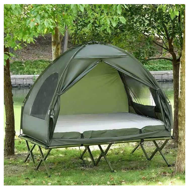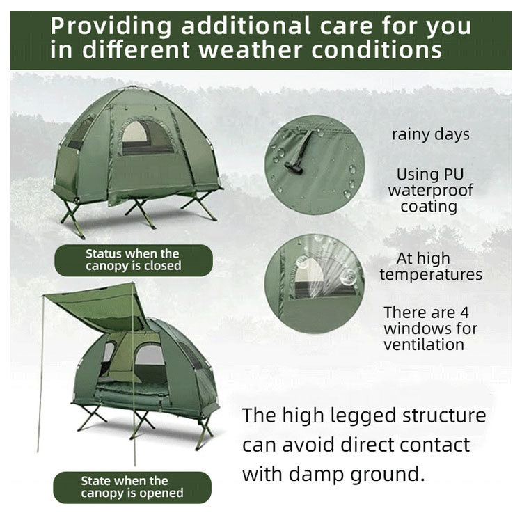 बिल्ट-इन, एलिभेटेड स्लीपिङ प्लेटफर्मको सुविधा दिन्छ जसले आर्द्रता-प्रूफ सुरक्षालाई परिष्कृत आरामसँग जोड्छ, प्रभावकारी रूपमा तपाईंलाई ओसिलो जमिनबाट अलग गर्छ र इन्सुलेशन सुधार गर्दछ।
