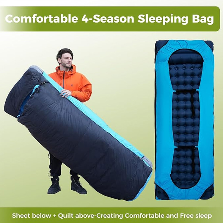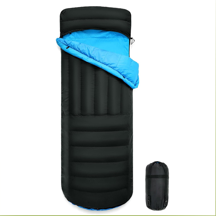 अल्ट्रालाइट डाउन क्याम्पिङ ब्ल्यान्केट डक डाउन स्लीपिङ प्याड।Wilderness Adventures को लागि तपाईंको अल्टिमेट फोर-सिजन निद्रा प्रणाली। यो अल्ट्रालाइट डाउन स्लीपिङ ब्यागले प्रिमियम डक डाउन इन्सुलेशनलाई एकीकृत इन्फ्लेटेबल प्याडसँग जोड्दछ। दुबै टपक्विल्ट र स्लीपिङ ब्यागको रूपमा कार्य गर्दै, यसले वजनमा सम्झौता नगरी अधिकतम न्यानोपन प्रदान गर्दछ।