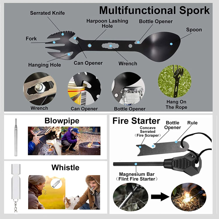 क्याम्पिङ हाइकिङ फिशिङ हन्टिङका लागि होलसेल सर्वाइभल गियर किट। आउटडोर साहसिक कार्यहरूको लागि तपाईंको परम सबैमा एक अस्तित्व समाधान। यो व्यापक गियर किटमा आपतकालीन एस्केप एक्स, सिग्नलिङ व्हिसल, र भरपर्दो फायर स्टार्टर समावेश छ। क्याम्पिङ, पर्वतारोहण, माछा मार्ने, र शिकारको लागि डिजाइन गरिएको, यसले गम्भीर परिस्थितिहरूमा अधिकतम तयारी सुनिश्चित गर्दछ।